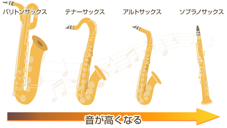 サックスには小さなものから大きなものまで、いろいろな種類があります。